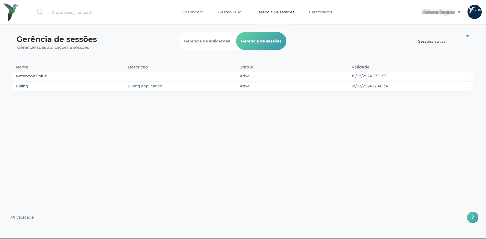 Clicando na aba "**Gerência de sessões**”, será possível verificar as sessões existentes no seu Bird ID