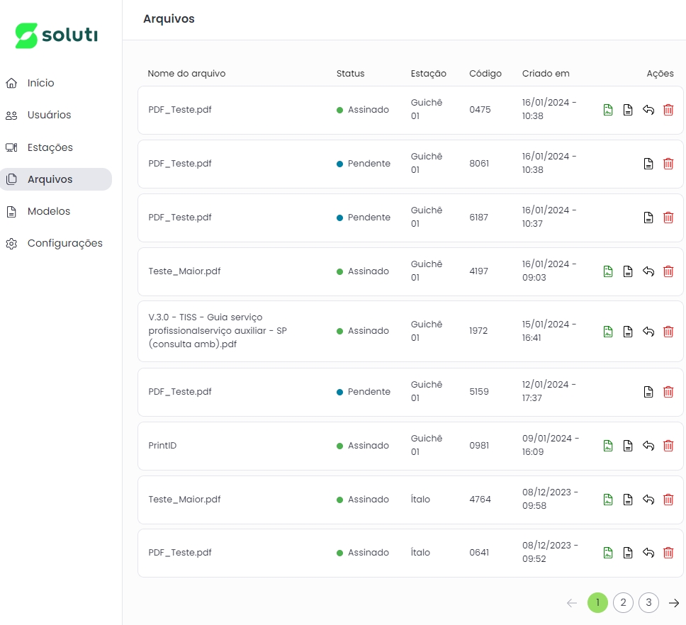 Neste menu serão exibidos todos os arquivos que foram enviados para impressão naquela determinada rede (servidor). É possível também baixar o arquivo original ou o arquivo assinado. Além disso, é possível excluir o arquivo da lista, o que não significa que ele será excluído da pasta na rede, será uma exclusão apenas na tela do Print ID.
