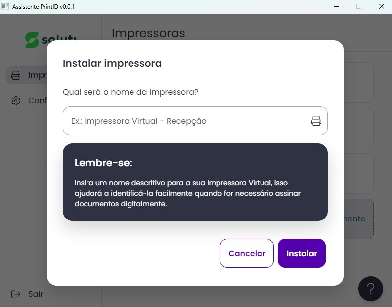 Após isso, será aberto um pop up para que o usuário possa nomear a estação de trabalho da sua máquina e clicar em instalar. Pronto, a impressora virtual estará pronta para utilização.